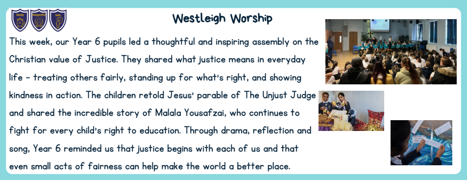 Each class takes one of our school values to champion. This ensures that children cover all 8 values during their journey at Westleigh Methodist. Year 6's value is 'Justice' and they share their learning and knowledge of justice with the rest of the school and their families during their class worship each year.
